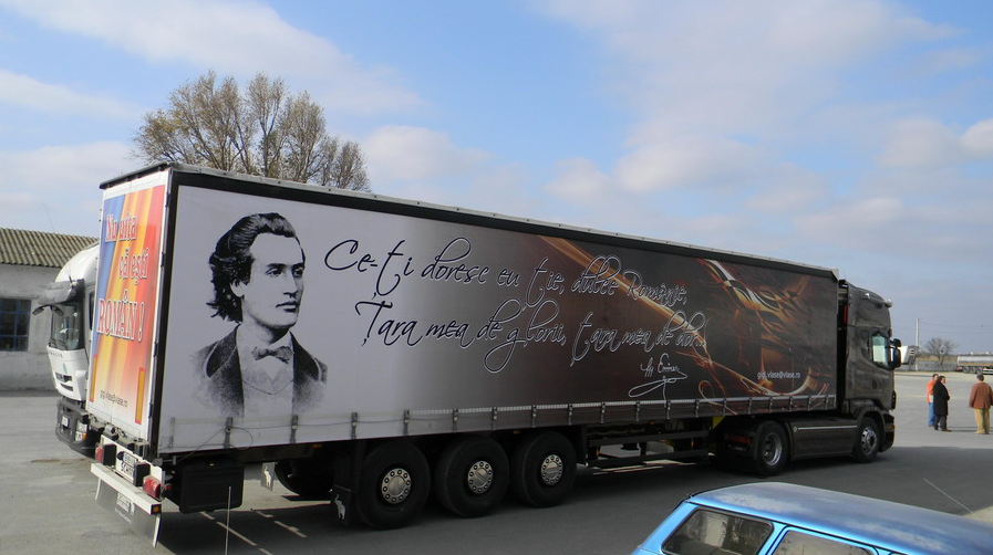 O imagine surprinsă în trafic pe o autostradă din Europa arată faptul că în România încă mai există patrioți, oameni care sunt mândri că sunt români. Sau, cel puțin, unul dintre ei sigur este. Omul și-a „decorat” TIR-ul pe părțile laterale cu un citat și o fotografie de-a lui Eminescu, iar pe ușile din spate este […]