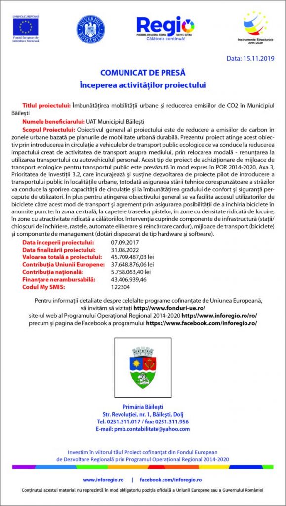 Proiectul „Imbunatatirea mobilitatii urbane si reducerea emisiilor de CO2 in Municipiul Bailesti” s-a semnat 09.10.2019 valoarea acestuia fiind de 45.709.487,04 lei. Este finantat prin Programul Operational Regional, Axa prioritară 3 – „Sprijinirea tranziției către o economie cu emisii scăzute de carbon”, Prioritatea de investiții „Promovarea unor strategii cu emisii scăzute de dioxid de carbon pentru […]